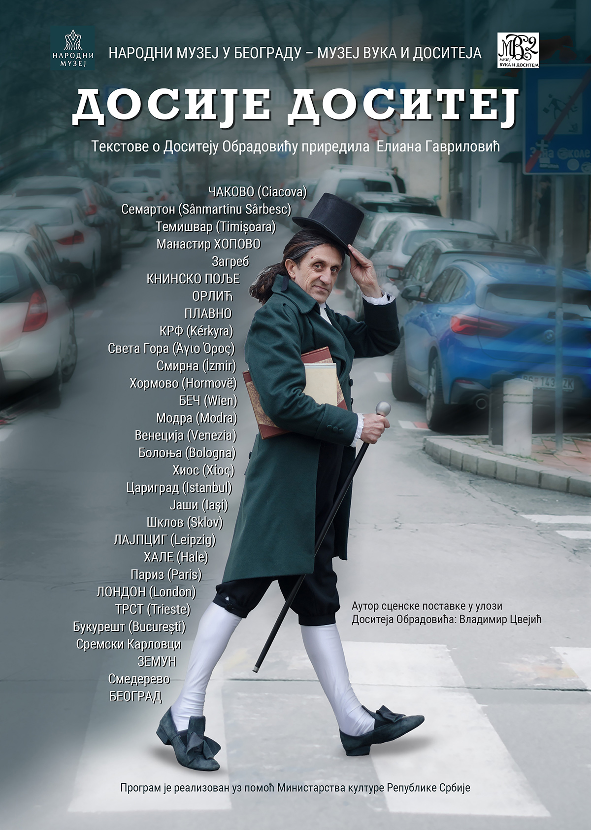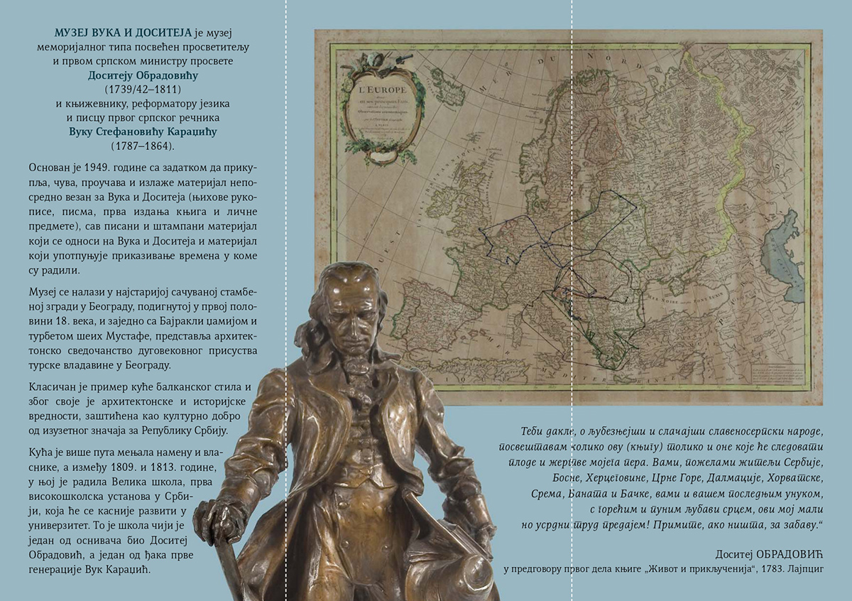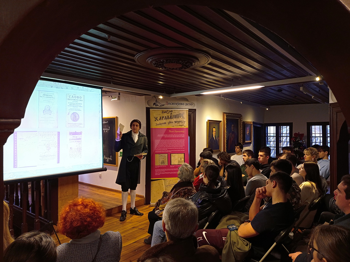 Спајањем Доситејеве биографије и простора у коме се представа одвија у потпуности ће доћи до изражаја интерпретативна моћ музејског театра, кроз приказ једне историјске личности чије је дело нераскидиво повезано са здањем у коме се данас Музеј налази. Лик Доситеја Обрадовића игра аутор поставке, глумац Владимир Цвејић. Он приказује епоху у којој је Доситеј живео, људе с којима се сусретао и раздобље освита модерне српске државе. Ова поставка је намењена како позоришној публици тако и у сврху образовног карактера за студенте и ученике. Кроз представу, путем видео пројекције, пратимо мапу путовања и све градове и места које је Доситеј посетио и где је боравио и учио.