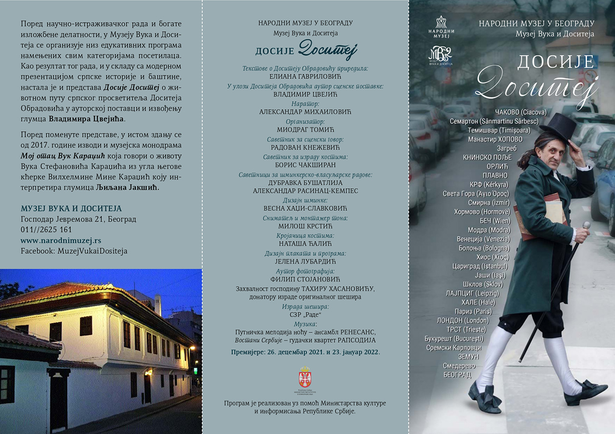 Монодрама "Досије Доситеј", из пера Елиане Гавриловић, инспирисане животном причом нашег великог просветитеља, књижевника и филозофа Доситеја Обрадовића, премијерно je изведена 26. 12. 2021.